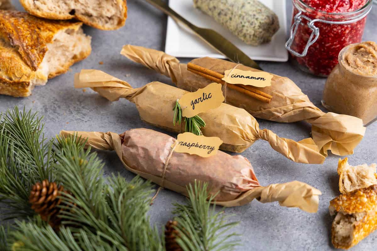 Tre tronchetti di composto per burro avvolti con carta forno ed etichettati con cartellini regalo.