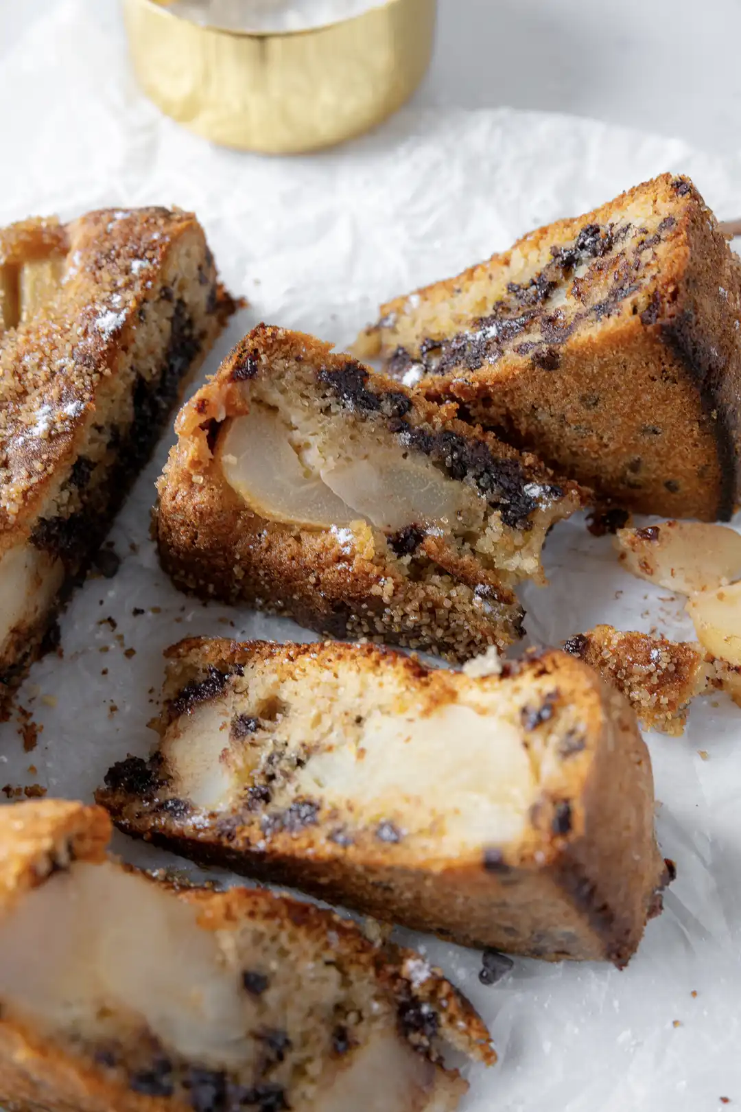 - Pears and chocolate: let yourself loose here because quantities may vary according to your own taste. I like my cake very rich in chocolate, so I add plenty of chocolate chips. Remember to top the batter with the pears just before baking so that they integrate evenly into the cake.