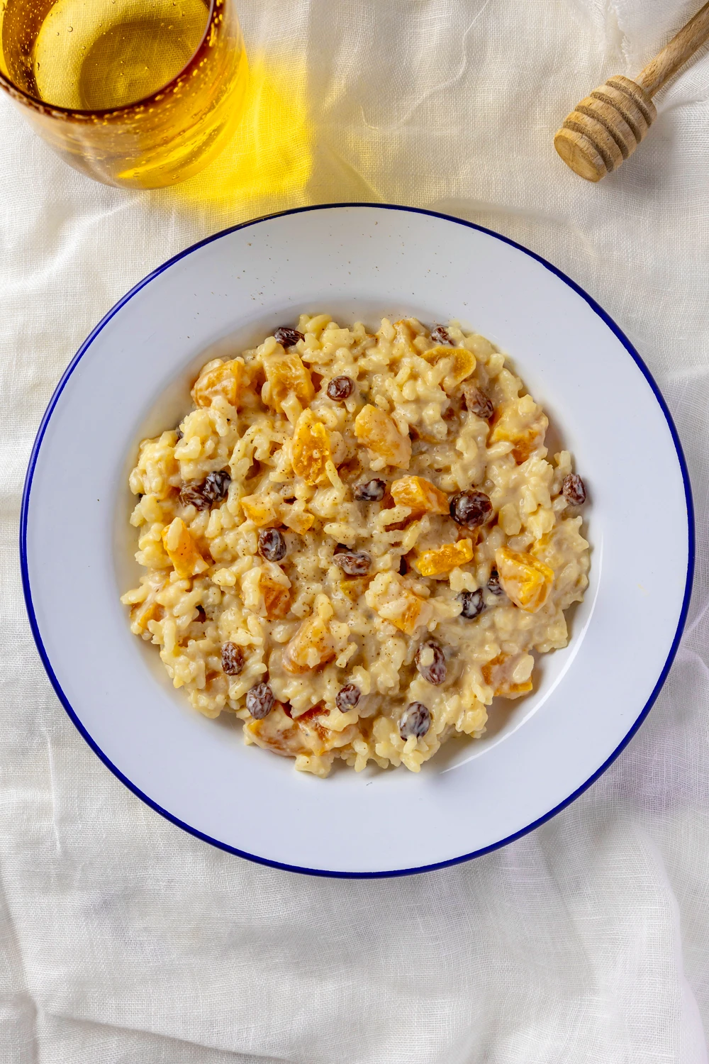 The dried apricots add a hint of color and a fruity note that pairs beautifully with the creamy rice. The raisins soften during cooking, releasing sweetness and a slightly caramelized note. Finally, the candied orange adds freshness and a citrus fragrance that balances the sweetness of the pudding, creating a perfect harmony among the ingredients.