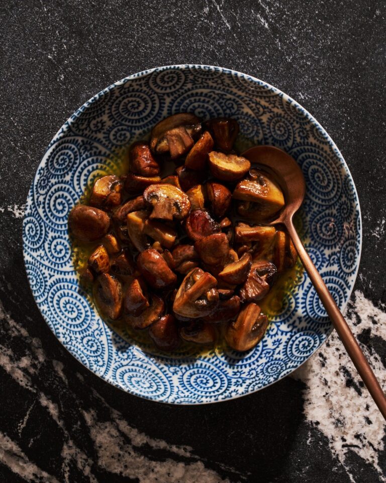Prepara i funghi: in una padella capiente a fuoco medio, aggiungi l’olio. Quando sarà caldo e luccicante, aggiungere i funghi con la parte tagliata rivolta verso il basso e cuocere fino a quando la parte inferiore sarà dorata, ovvero 6-8 minuti. Girare e continuare la cottura fino a quando gli altri lati saranno dorati, altri 3-4 minuti. Aggiungere il burro e cuocere, mescolando di tanto in tanto, finché il burro non si scioglie e inizia a schiumare, circa 1 minuto. Incorporare 1 cucchiaio di salsa koji e cuocere, bagnando continuamente i funghi con la salsa, fino a quando la salsa sarà lucida e ridotta di circa la metà, circa 2 minuti. Unire l’aceto di riso, quindi trasferire su un piatto da portata e servire caldo.