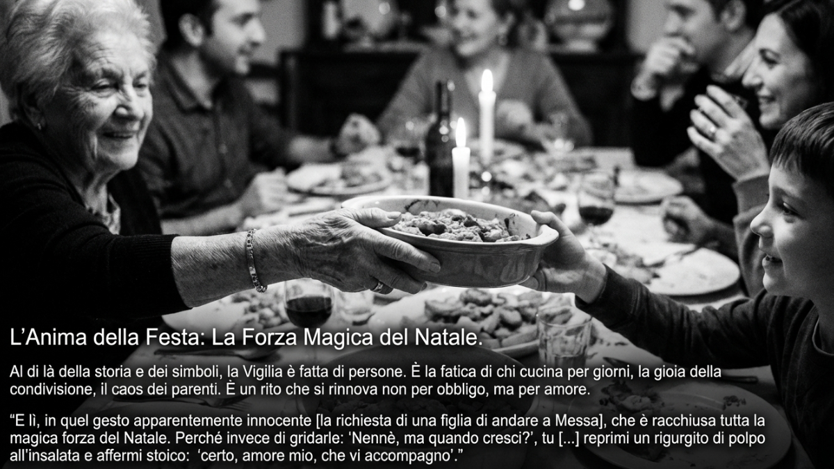 Se c’è un giorno che a Napoli regna sovrano su tutti gli altri, è il 24 dicembre. Non è un giorno qualunque, è la regina delle feste, una giornata lunghissima che sembra contenere un intero anno di attese, profumi e fatiche. A casa mia, fin dalle prime luci dell’alba, l’aria è già satura. Non è solo l’odore del caffè che sale dalla moka, ma un presagio più denso, un misto di aglio che sfrigola, di agrumi e di mare. È la quiete prima della tempesta, un silenzio operoso rotto solo dal tintinnare ritmico dei coltelli sul tagliere. La matriarca di casa, mia madre, si muove in cucina con la concentrazione di un generale prima della battaglia decisiva. La Vigilia è il suo capolavoro, e noi siamo le sue truppe, pronte a un’epica disfatta calorica.