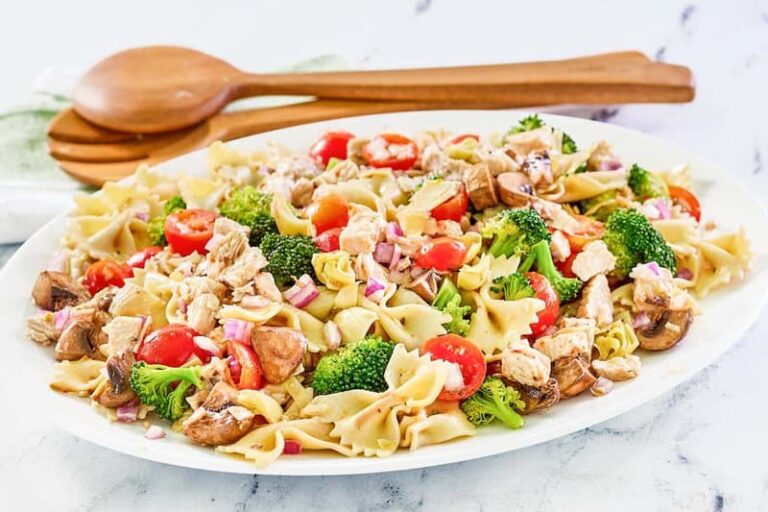 Tuffati in una ciotola di insalata di pasta di pollo per un pasto rinfrescante e abbondante! Questo piatto combina teneri pezzi di pollo, verdure vivaci e pasta con condimento per l’insalata italiana. Perfetta per i picnic estivi, i pranzi o come pranzo veloce, questa insalata di pasta fredda non è solo visivamente accattivante ma anche piena di sana bontà.