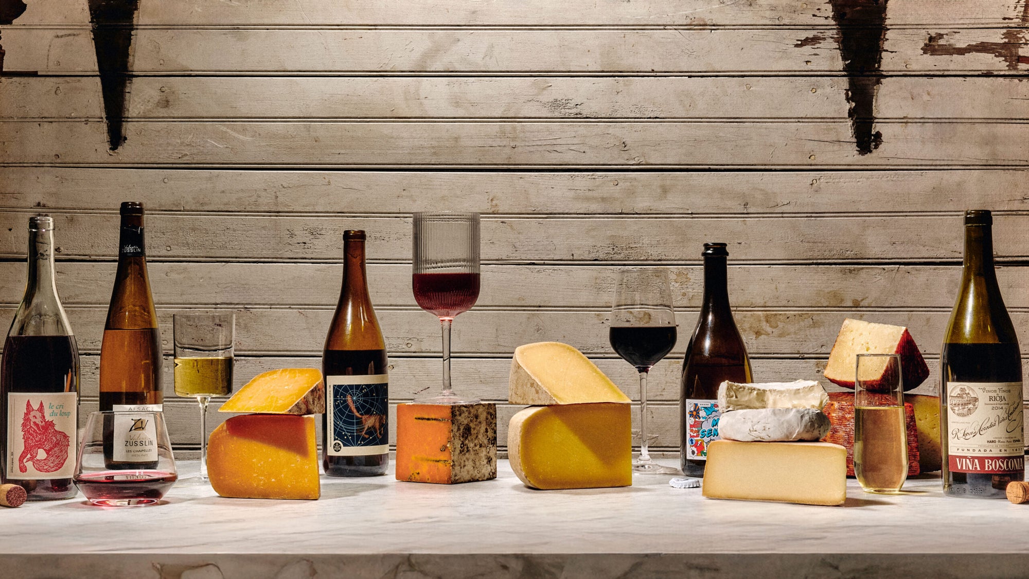 2021 Valentin Zusslin Les Chapelles Riesling, Alsazia, Francia + Alpinage Cheese Classic Raclette, Oak Creek, Wisconsin + Uplands Cheese Pleasant Ridge Reserve, Dodgeville, Wisconsin