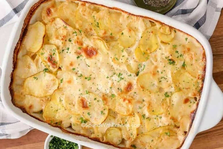 Le patate smerlate sono fatte con strati di patate a fette sottili cotte in salsa di crema di cipolle finché sono tenere. Questo classico è accogliente e confortante.