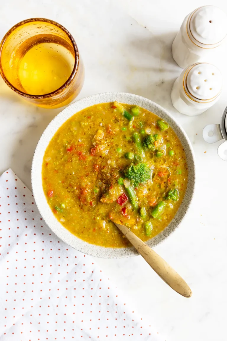 Versa abbastanza brodo vegetale da coprire le verdure, circa 3 cm sopra di esse. Coprite parzialmente la pentola con un coperchio e lasciate cuocere per circa 25 minuti, mescolando di tanto in tanto. Se la zuppa dovesse risultare troppo densa aggiungete un po’ d’acqua. - Finisci la zuppa: