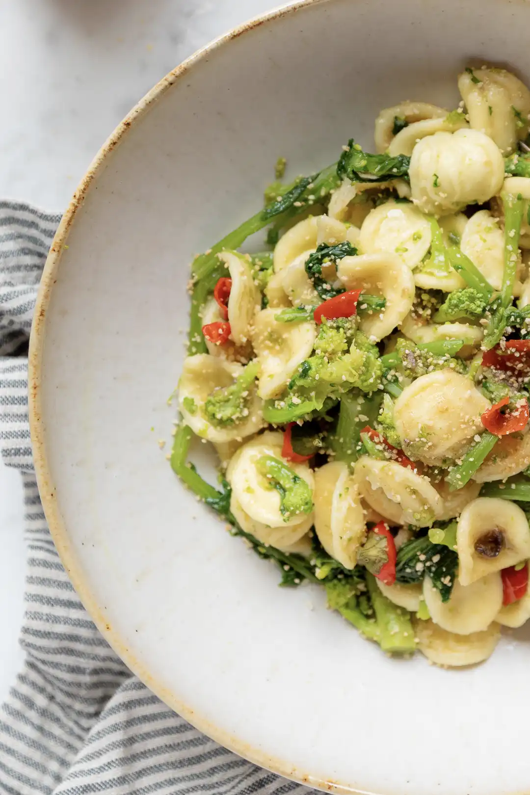 Questo piatto di pasta, diffuso in tutta la Puglia, può essere abbinato alle cime di rapa ma anche ai broccoli o al sugo di pomodoro. Poiché le cime di rapa non sono disponibili tutto l’anno, è possibile utilizzare le cime di rapa o rapini in Italia. Sono simili nel gusto. O meglio ancora, cerca i broccoli cinesi (Gai Lan), comuni nei negozi di alimentari asiatici negli Stati Uniti.
