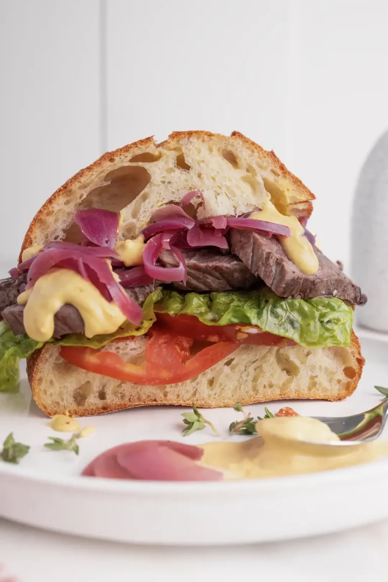 Le possibili varianti del sandwich con bistecca sono limitate solo dal vostro gusto e dalla vostra fantasia. Cipolle caramellate, funghi saltati, peperoni grigliati e formaggio fuso sono aggiunte frequenti che esaltano il sapore della carne. Salse come maionese, senape, aioli o una riduzione di aceto balsamico possono aggiungere un tocco in più al panino.