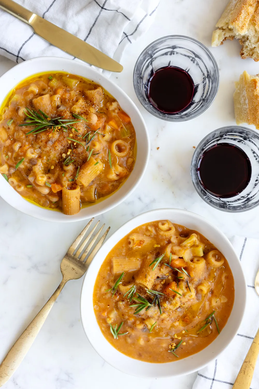 Condire nuovamente la zuppa con sale e pepe a piacere, quindi completare con un filo d’olio d’oliva e una spolverata di erbe secche. Per un po ‘di calore, puoi aggiungere scaglie di peperoncino. Servitelo ben caldo, condito con Parmigiano appena grattugiato, e godetevi questo piatto confortante e rustico!