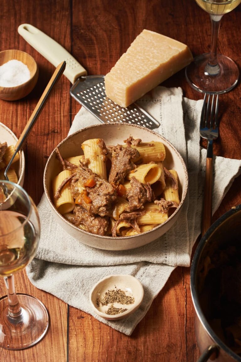 - Manzo (600 grammi/~1,1 libbre) – questa ricetta prevede la spalla o la lama di manzo, ma in tempi più magri in passato veniva spesso realizzata con ritagli di manzo o anche solo con pezzetti di salame e prosciutto avanzati da altre pietanze. Se preferite potete anche togliere la carne e servirla come secondo piatto e condire la pasta semplicemente con la salsa cremosa di cipolle.