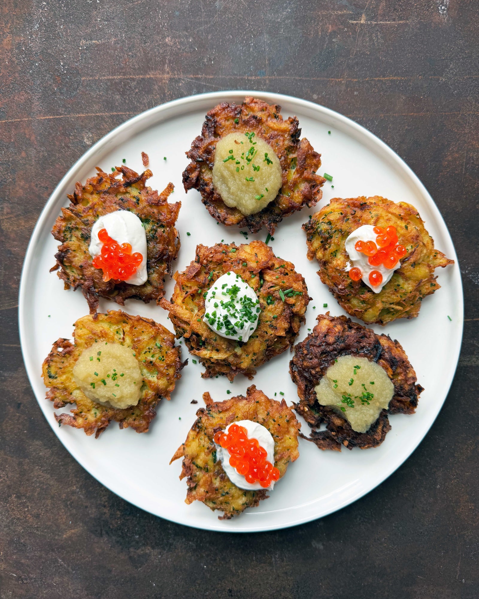 In una padella capiente, versare ¼ di pollice di olio e regolare il fuoco a medio-alto. Quando l’olio è caldo e luccicante, lavorando in lotti, formare porzioni di ¼ di tazza della miscela di latte in palline e immergerle nell’olio. Appiattire delicatamente le palline con una spatola per formare pancake da 3-4 pollici. Friggere, girando una volta, fino a doratura, croccante e cotta, circa 8 minuti. Trasferisci i latkes su un piatto rivestito di carta assorbente per scolarli. Servire caldo con salsa di mele o panna acida, caviale ed erba cipollina se lo si desidera.