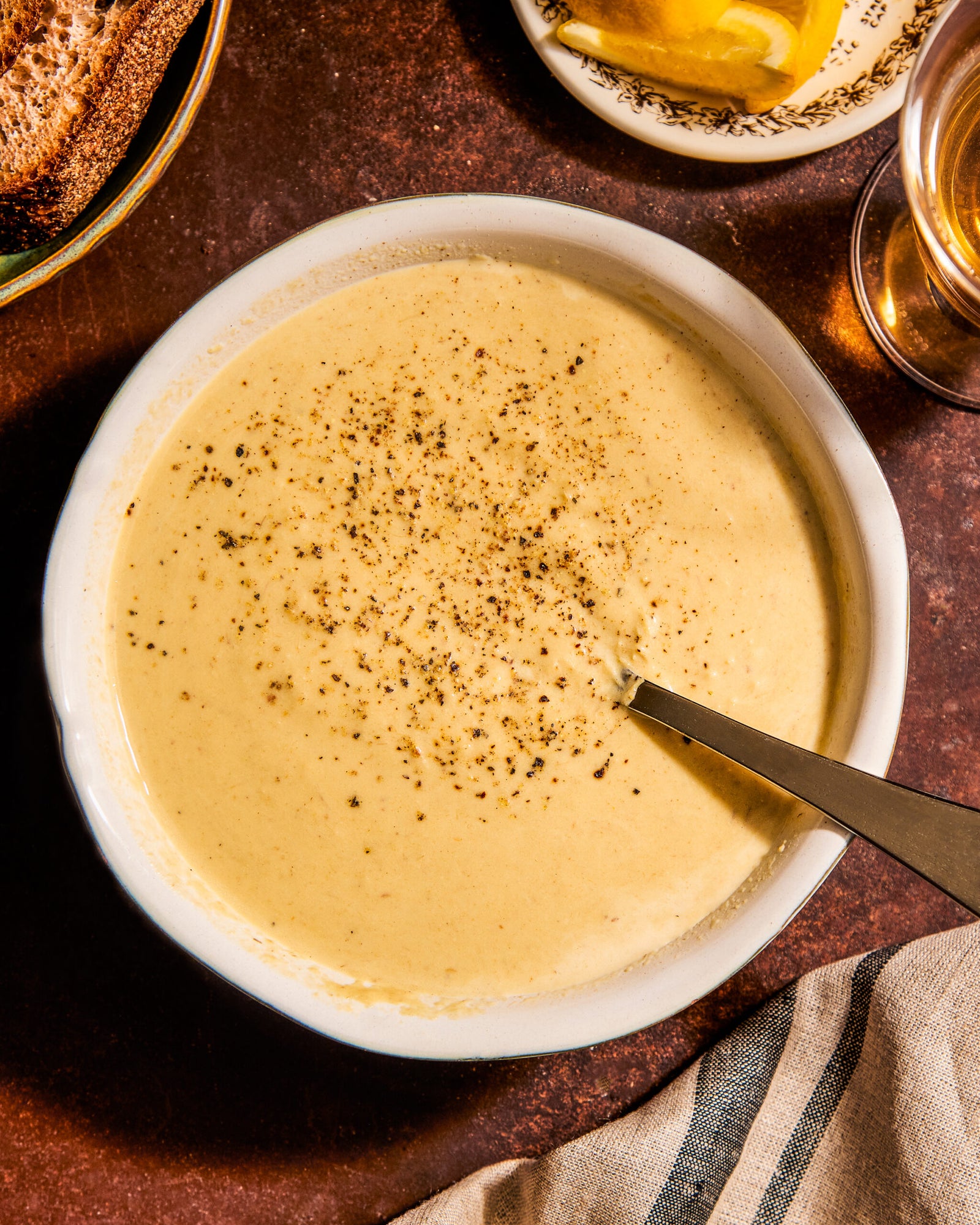 Trasferite il composto in un frullatore o in un robot da cucina e riducetelo con cura (o riducetelo in una pentola con un frullatore ad immersione). Ritorna nella pentola, aggiungi la panna e porta a ebollizione a fuoco medio. Cuocere, mescolando di tanto in tanto, fino a ridurlo di un terzo, circa 45 minuti. Condire a piacere con sale e pepe nero. Servire con spicchi di limone e pane a lievitazione naturale a parte.