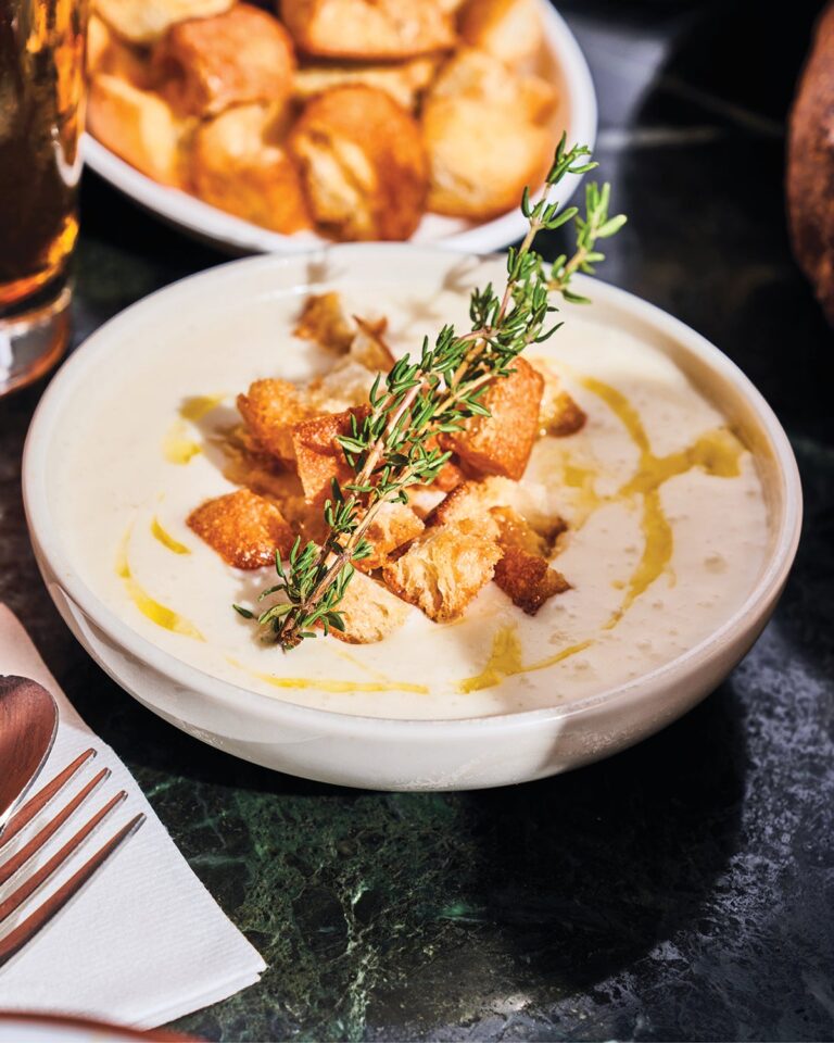 Prepara la zuppa: in una pentola capiente a fuoco alto, aggiungi il burro e l’olio d’oliva. Quando sarà caldo e luccicante, aggiungere le pastinache e cuocere, mescolando di tanto in tanto, fino a quando saranno ben dorate in alcuni punti, per 6-8 minuti. Accendere il fuoco a una temperatura media, aggiungere l’aglio, il porro e la cipolla e cuocere, mescolando di tanto in tanto, fino a quando la cipolla sarà ammorbidita e traslucida, circa 10 minuti.
