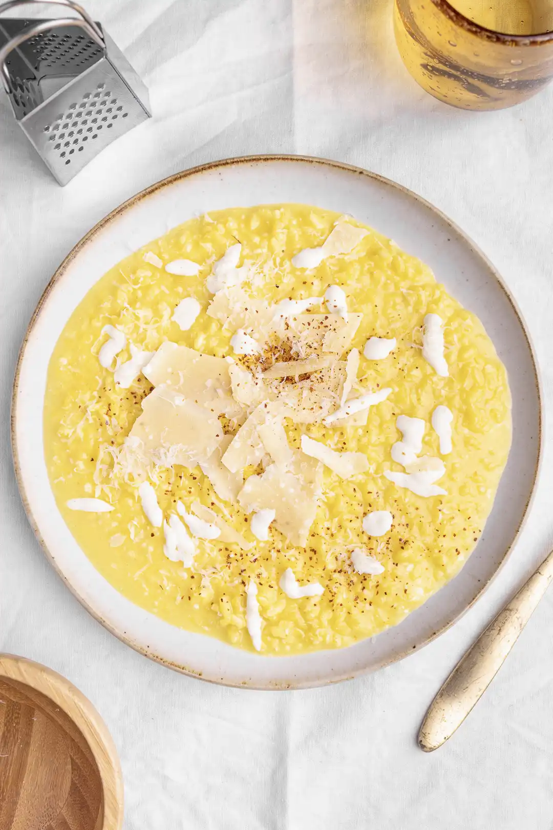 Formaggio: Potete utilizzare tutti i tipi di formaggio secondo i vostri gusti. Un formaggio che si abbina bene al Risotto allo Zafferano è la scamorza con aggiunta di Parmigiano. Formaggi troppo intensi o affumicati potrebbero sopraffare il sapore dello zafferano.