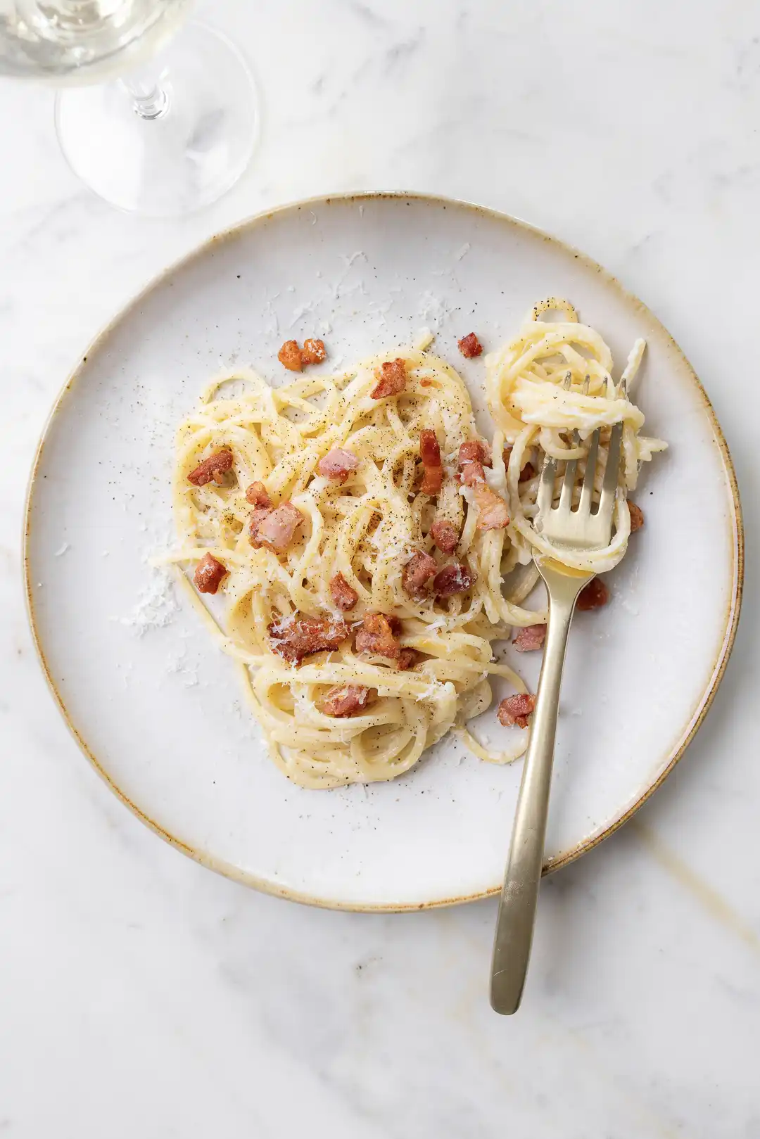 - La ricetta non prevede l’aggiunta di olio o panna: è sufficiente il grasso piccante del guanciale;