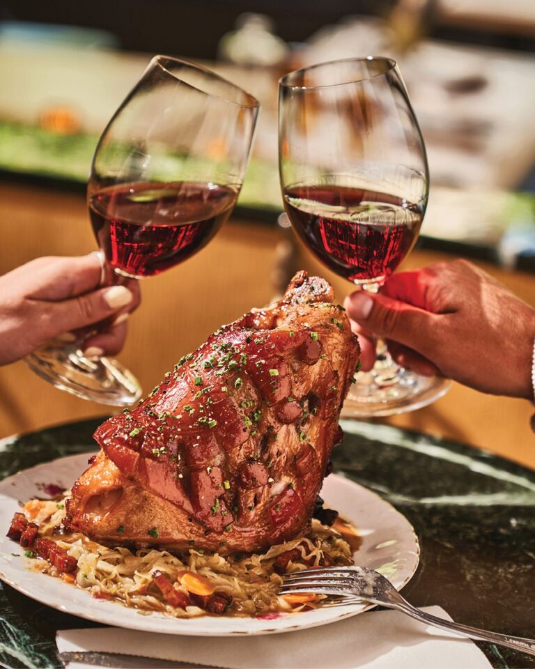 Cuocere, girando lo stinco ogni 30-40 minuti, fino a quando il maiale sarà glassato e lucido e la carne si spezzerà facilmente se forata con una forchetta, circa 3 ore.